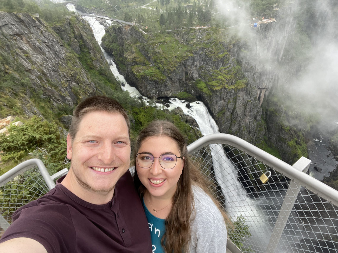 Gegen halb 9 fahren wir ausgeschlafen zum Vøringsfossen, dem vielleicht berühmtesten Wasserfall Norwegens. Dort erleben wir auf den neu angelegten Aussichtsplattformen, die um diese Zeit menschenleer sind, eine großartige Sicht auf den beeindruckenden Vøringsfossen, die anderen umliegenden Wasserfälle und das Tal. Weiter geht es auf den schönen Hochebenen entlang des Hardangervidda Nationalparks. Einen kurzen Stopp machen wir in Geilo. Bei einem Spaziergang gefallen uns besonders der Blick aufs Schigebiet und der schöne Platz vor dem Bahnhof. Am Spätnachmittag kommen wir schließlich nach 308 gefahrenen Kilometern in Oslo an. Dort dürfen wir die nächsten zwei Tage bei Sabrina und Frode verbringen. An diesem Abend sind zusätzlich noch Sabrinas Eltern und Freunde…