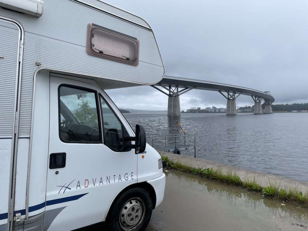 In Sundsvall angekommen, bleiben wir auf einem Parkplatz an der Sundsvallbrücke am Wasser stehen, genießen die Aussicht und warten bei einer Jause den Regen ab.