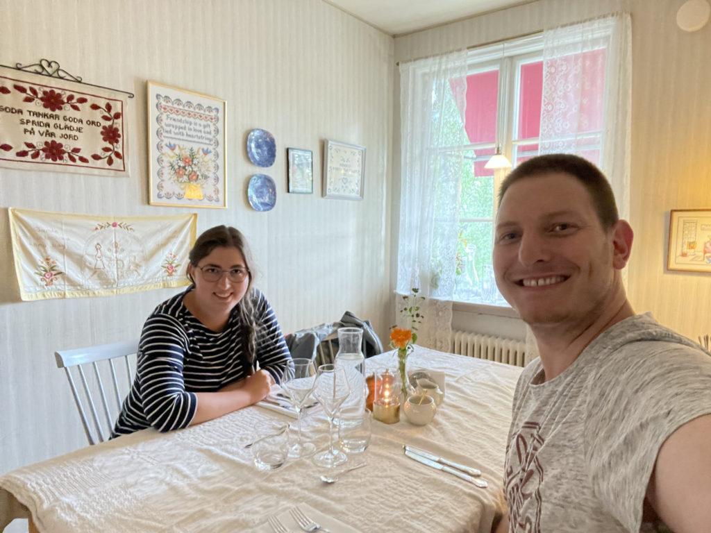 Bei einem 3-Gänge-Menü (Rentiertartare/Pilzsuppe, Fisch/Halloumi auf grünem Spargel mit Kartoffelpürree und Weißweinschaum, Eis und Kuchen mit Sanddorn) sehen wir die Liebe zum Detail und zur Natur, die der Familienbetrieb in den Baumhäusern, dem Gästehaus und beim Essen verwirklicht.