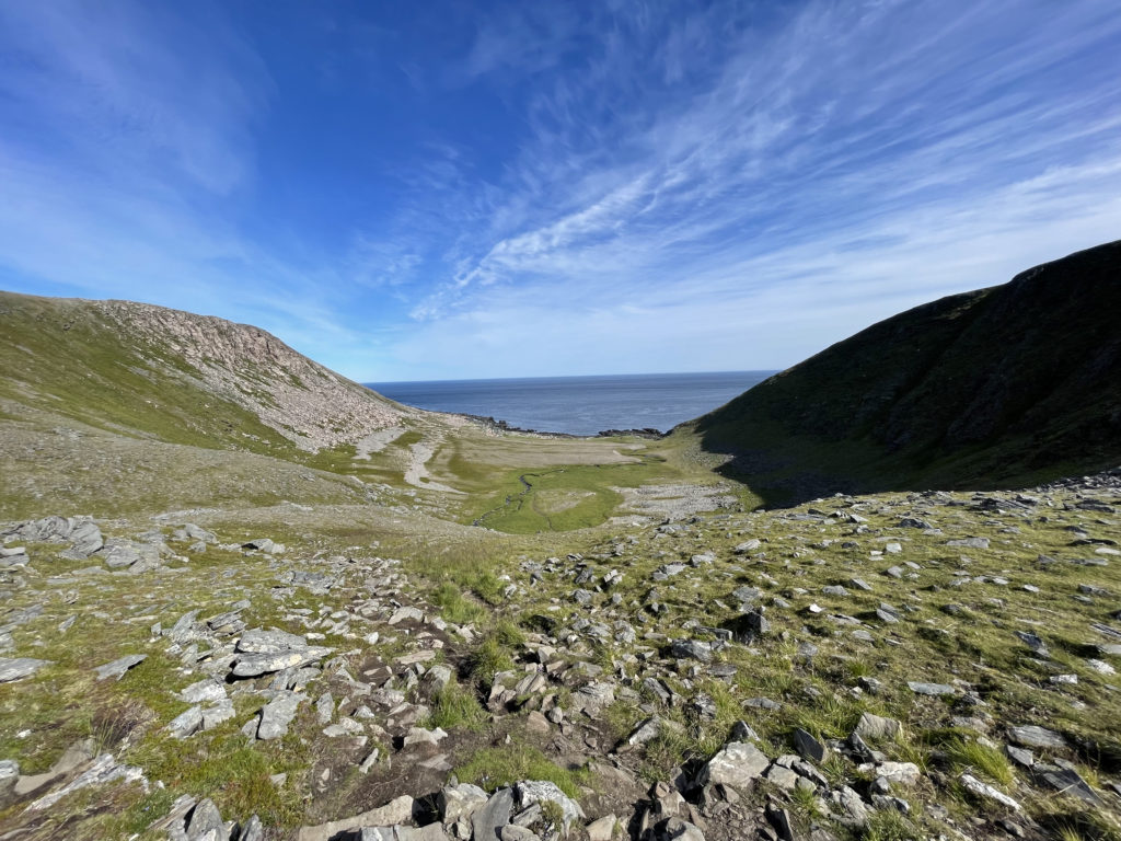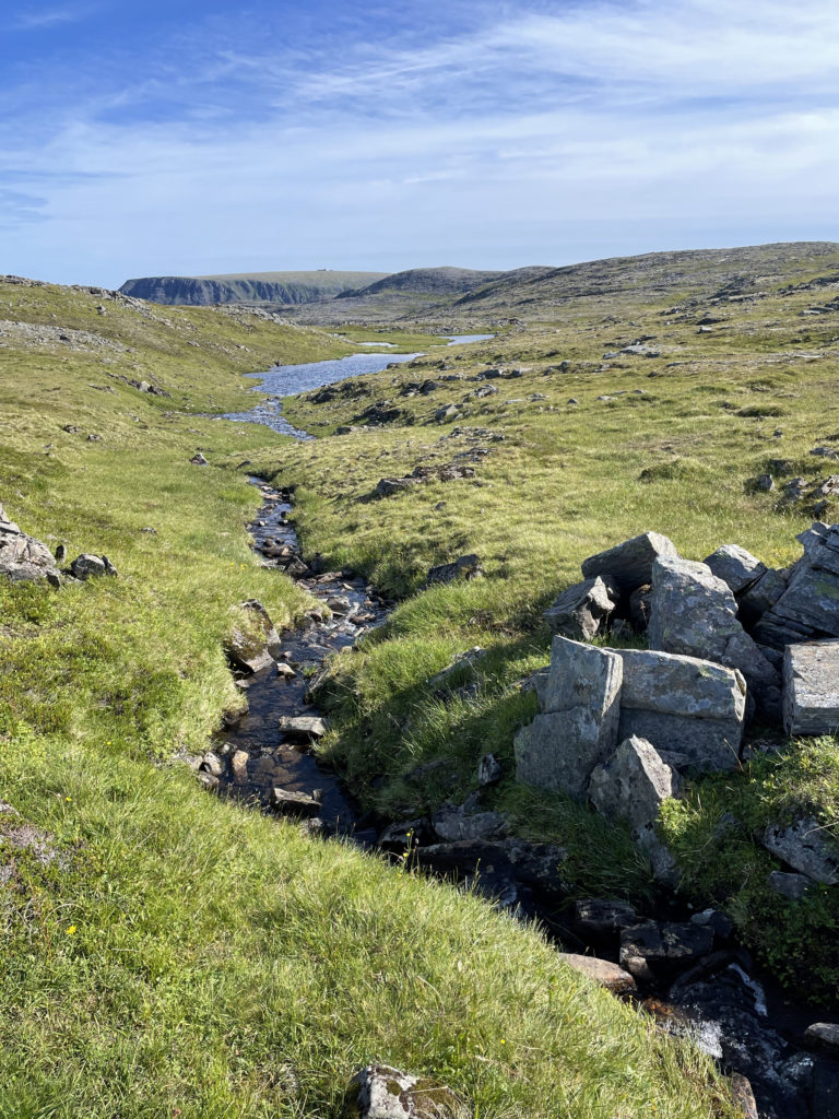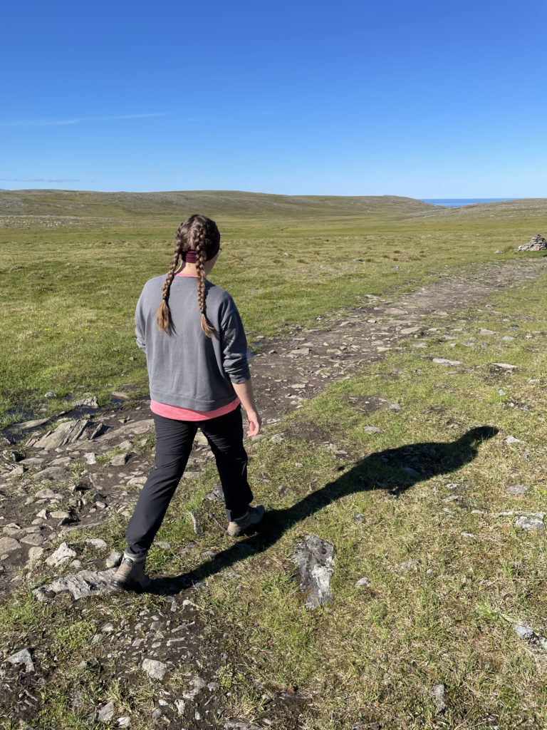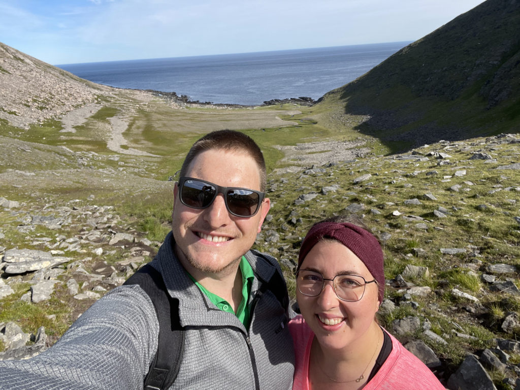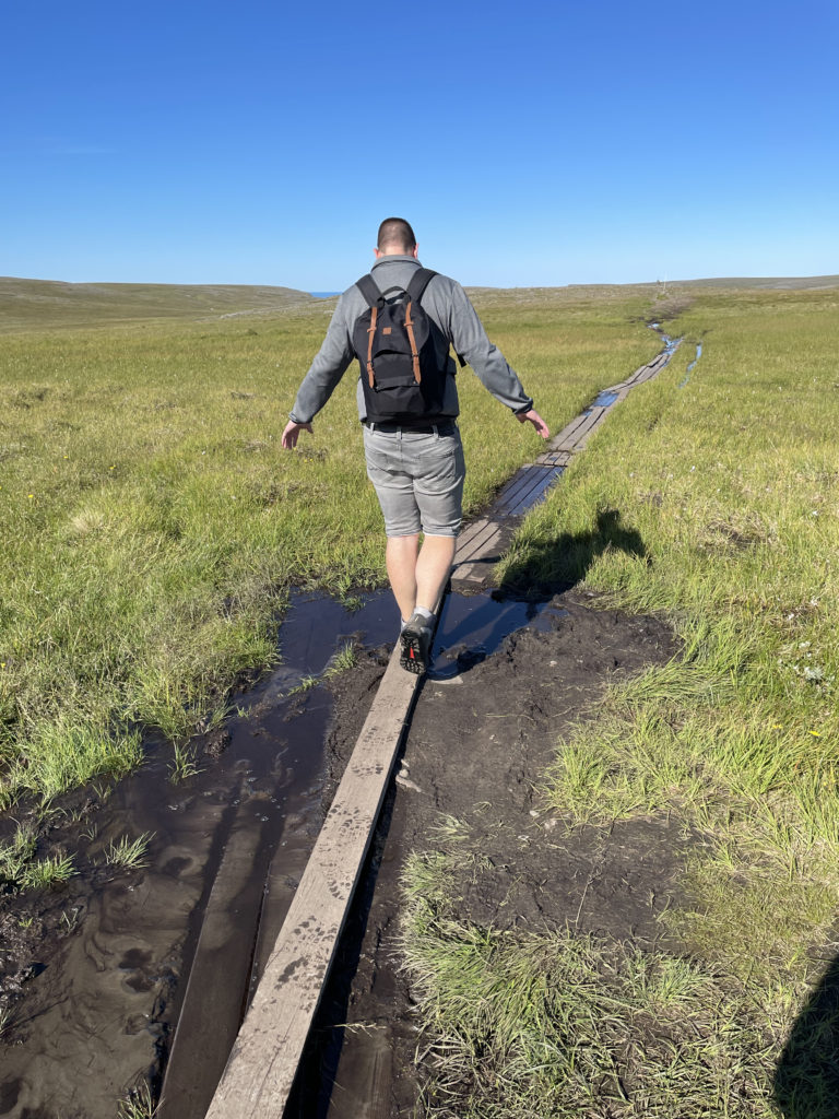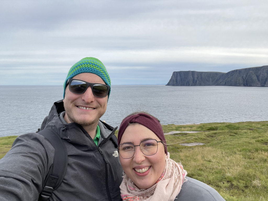 Um halb 10 fahren wir weiter und parken kurz darauf beim Startpunkt zum Wanderweg „Knivskjellodden“. Das ist die Landzunge, bei der man zu Fuß zum eigentlich nördlichsten Punkt auf der Insel Magerøya kommt. Die 1400 Meter weiter nördlich zum „wirklichen Nordkap“ wollen wir uns nicht entgehen lassen. Für den 16 Kilometer langen Weg – hin und retour – benötigen wir mit Pausen knappe 6 Stunden. Der Weg führt über viele Steine, Felsen und nasse Wiesen, vorbei an Rentieren und vielen Vögeln hin zum Meer. In einem Gästebuch haben wir uns eingetragen und dabei den Blick zum Aussichtspunkt und offiziellem Nordkap genossen.