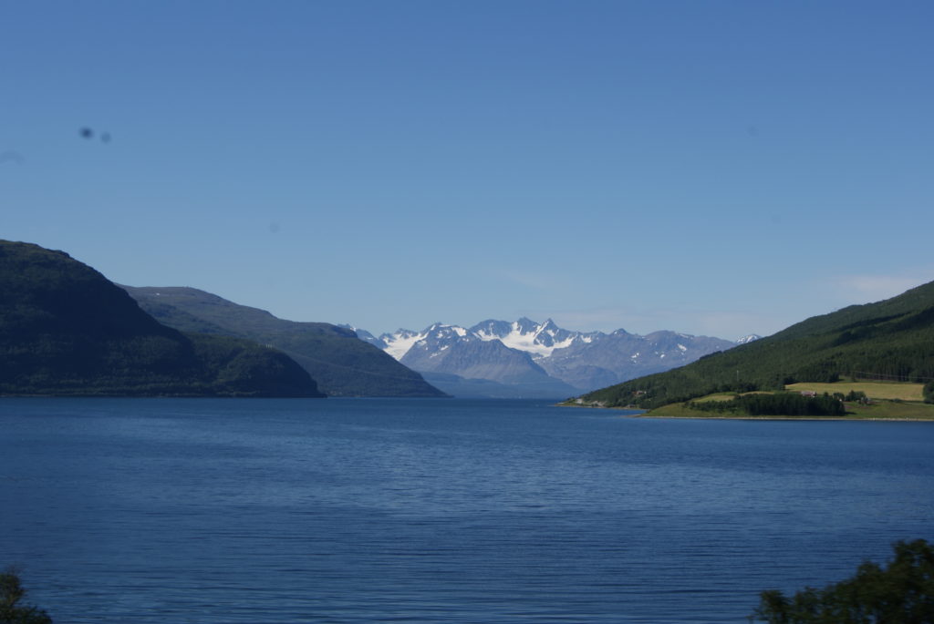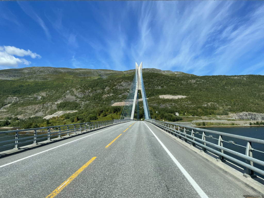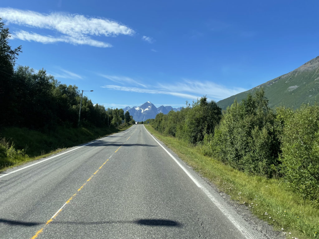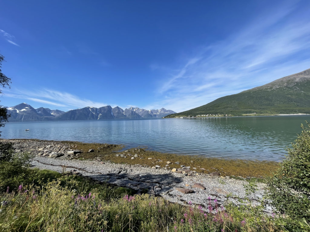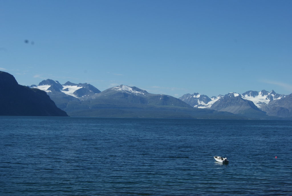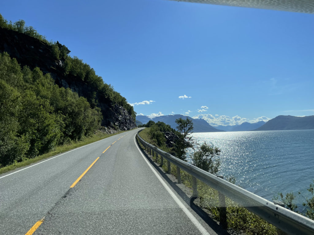 Besonders angetan haben es uns heute der Lyngenfjord und die Lyngenalpen, an denen wir lange entlang fahren. Obwohl wir 437 Kilometer zurücklegen, vergeht die Fahrzeit doch sehr schnell.