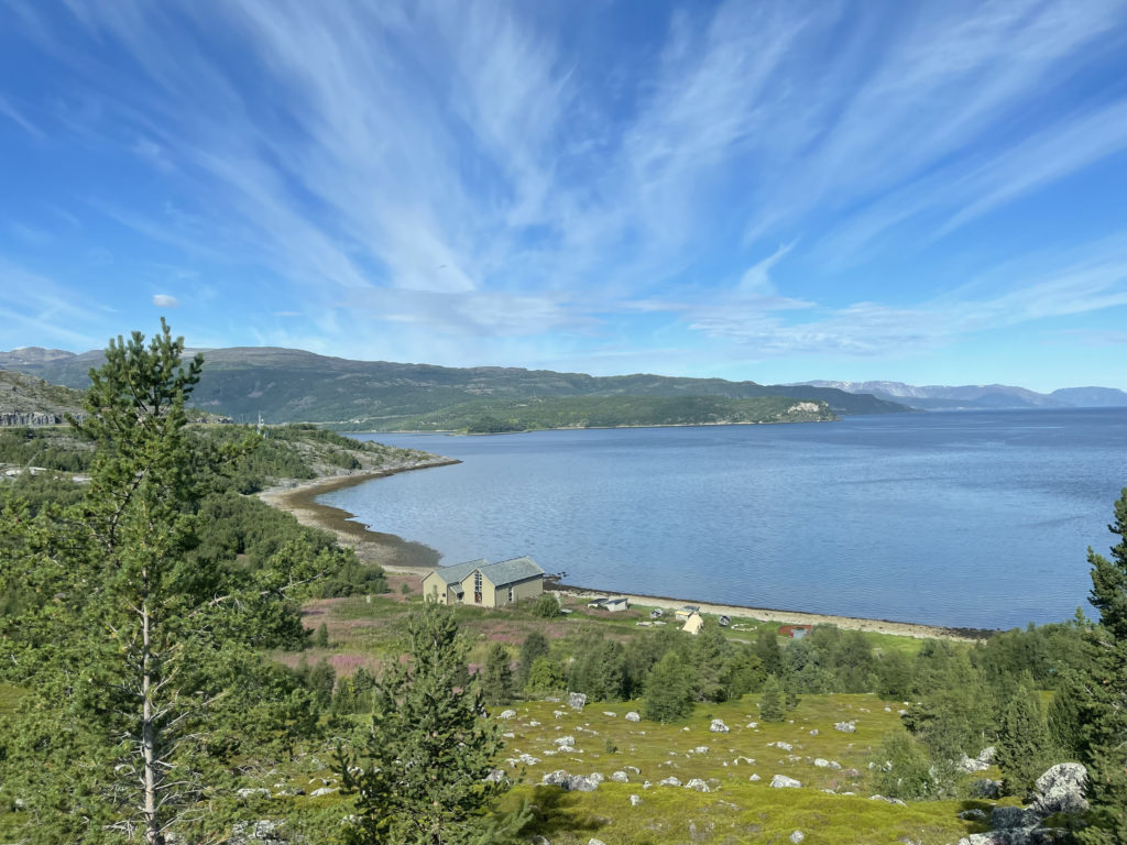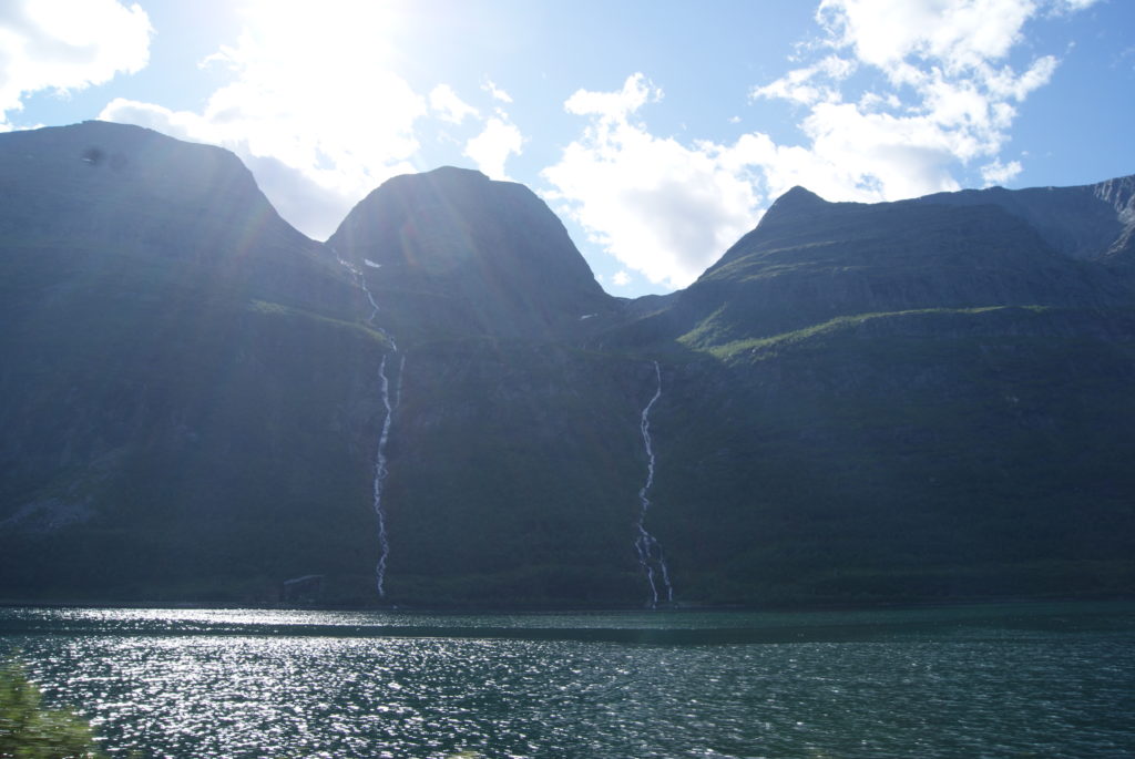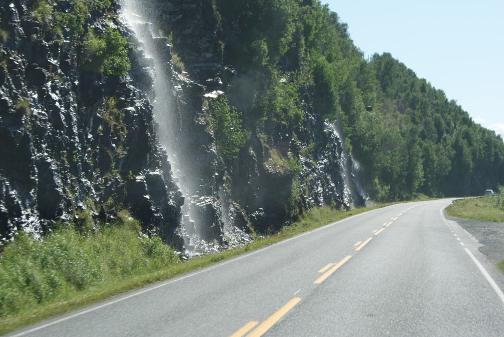 Gegen halb 11 verlassen wir gestärkt das Hotel und machen uns auf den Weg Richtung Lofoten. Die kurvenreichen, aber sehr gut ausgebauten Straßen führen uns bergauf und bergab, wobei wir die Aussicht mehr als genießen. Wunderschöne Fjorde, Seen und Wasserfälle kann man entlang des gesamten Weges bewundern.
