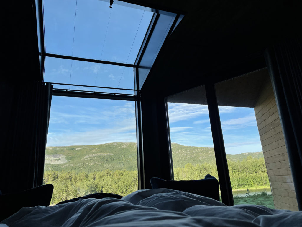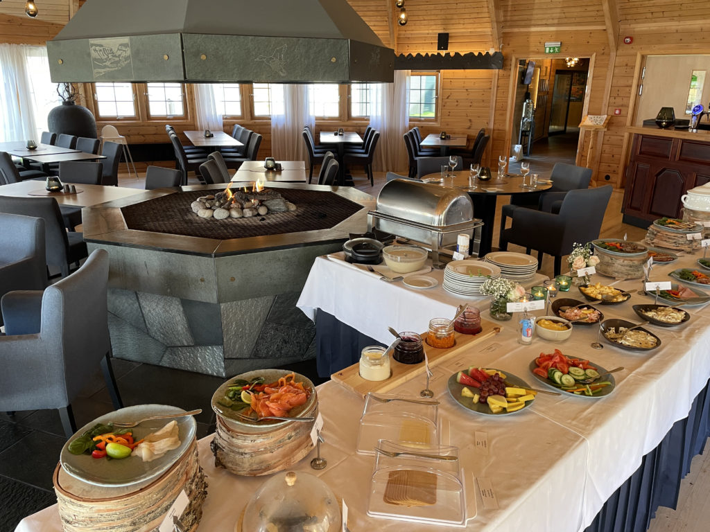 Mit einem wunderschönen Ausblick wachen wir auf und gehen zum Frühstück, wo uns ein wirklich leckeres Buffet erwartet. Von den norwegischen Spezialitäten, der gemütlichen Feuerstelle in der Mitte des Raumes bis hin zur Möglichkeit, selbst Waffeln zu machen, sind wir schwer begeistert.