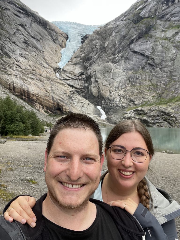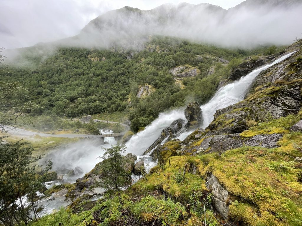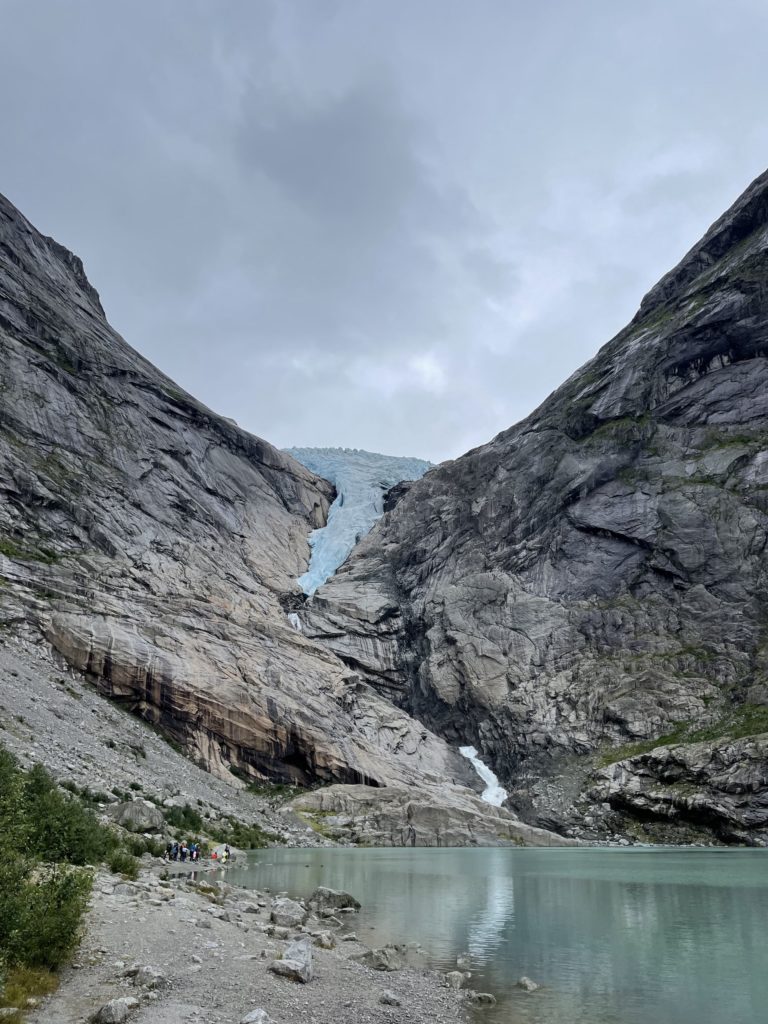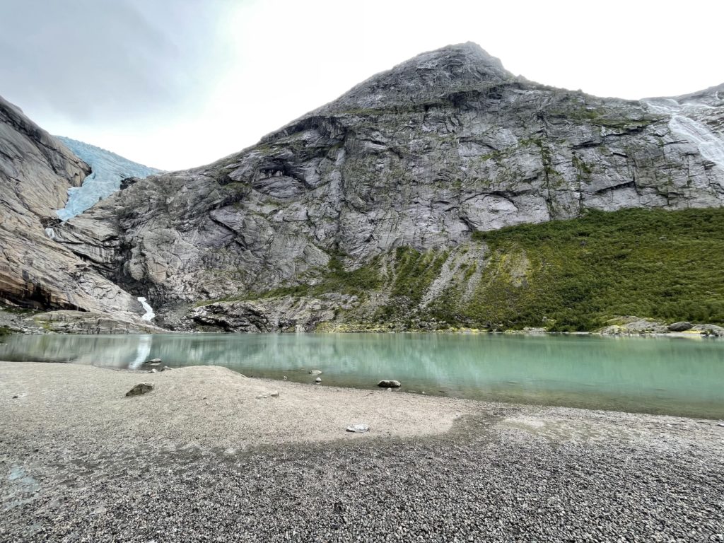 Unser Plan geht auf und wir können in Ruhe vor dem großen Touristenandrang die kurze Wanderung zum Gletscher antreten. Dabei werden wir nur von einem Bus spanischer Touristen begleitet. Nach ca. 45 Minuten kommen wir beim Schmelzwassersee Briksdalsvatnet an. Von dort aus genießen wir den Blick auf den nur wenige Meter höher liegenden Gletscher. Kurze Zeit später machen wir uns wieder auf den Weg nach unten, wobei uns bereits unzählige Touristen – unter anderem Passagiere der Iona – entgegenkommen.