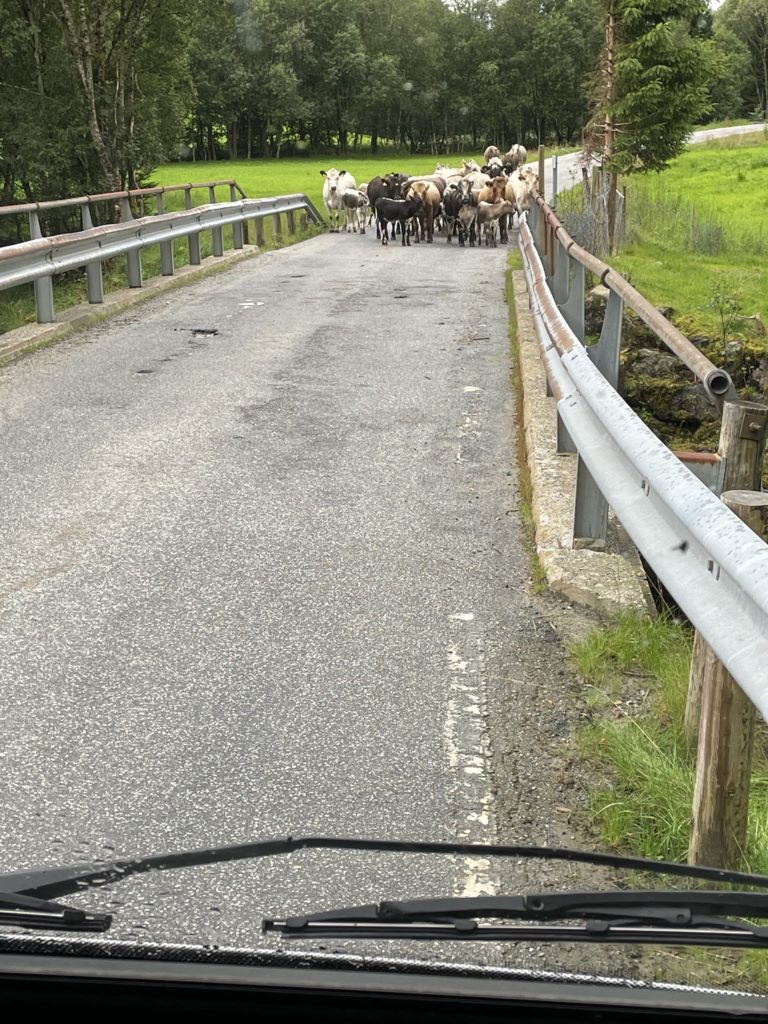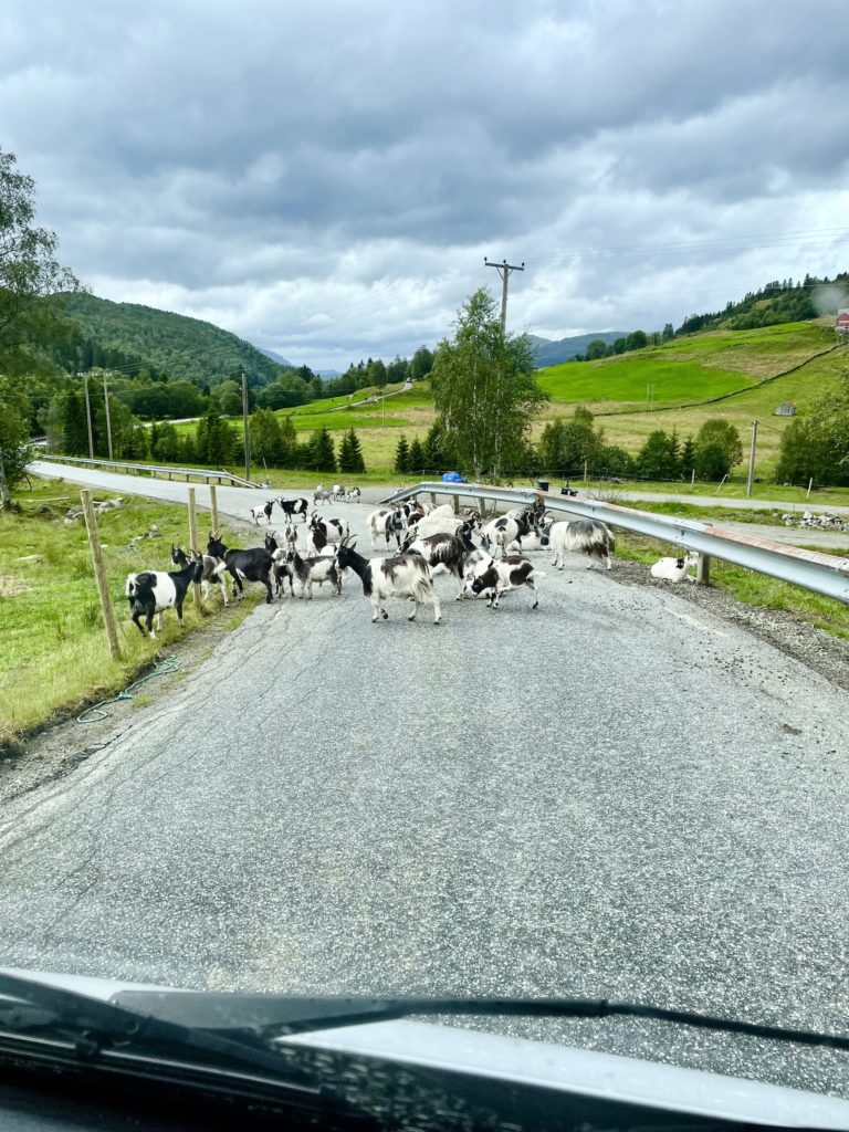 Den nächsten Halt machen wir in der kleinen Stadt Førde. Nach einem Spaziergang gönnen wir uns einen Kaffee und fahren anschließend zu einem weiteren Übernachtungs-Highlight, der Birdbox. Am Weg dorthin erweitern wir unsere Sammlung an tierischen Begegnungen auf der Straße um Ziegen und Kühe.