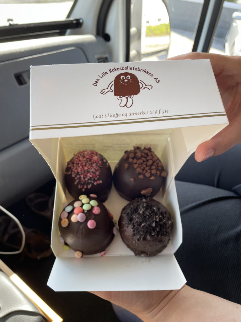 Am heutigen dritten „3-Länder-Tag“ machen wir zuerst einen Stopp bei „Den lille kokosbollefabrikken“, wo wir uns Kokoskuppeln mit verschiedensten Toppings als Stärkung für die Fahrt holen. Danke an Sabrina und Frode für diesen Tipp!