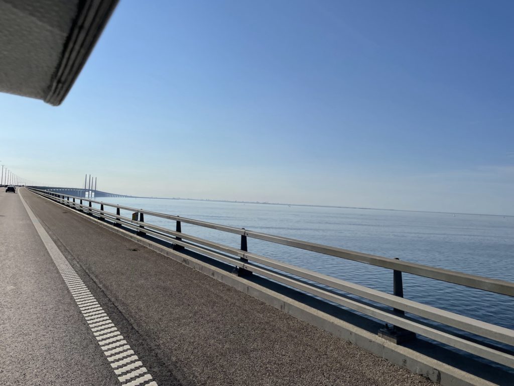 Bis zur Mittagspause verläuft der Tag reibungslos und wir kommen gut voran. Leider erhalten wir mittags einen Anruf aus der Hundepension, dass es Flocke seit dem Morgen nicht gut geht. Die Weiterfahrt ist deshalb von Anrufen, vielen Gedanken und Überlegungen geprägt. Am Spätnachmittag organisieren wir, dass Flocke in die Tierklinik gebracht wird, von wo wir leichte Entwarnung bekommen. Etwas beruhigt und mit dem Wissen, dass gut auf sie geschaut wird, können wir den Rest der heutigen insgesamt 687 Kilometer fahren. Ein Highlight während der Fahrt ist erneut die Öresundbrücke.