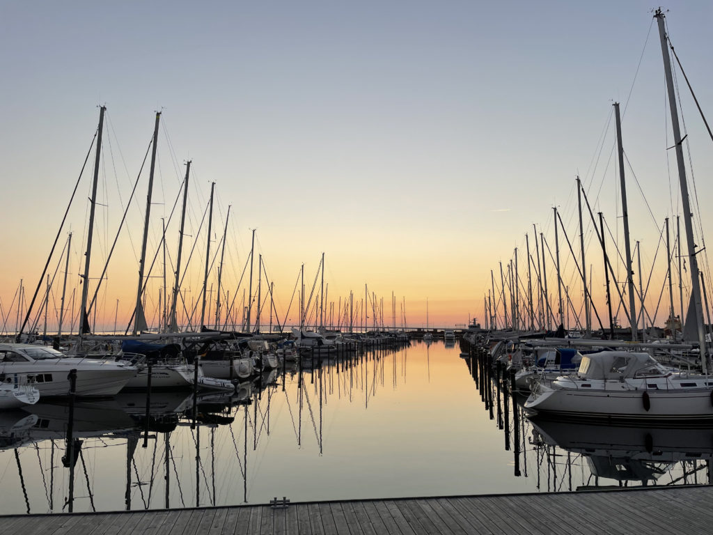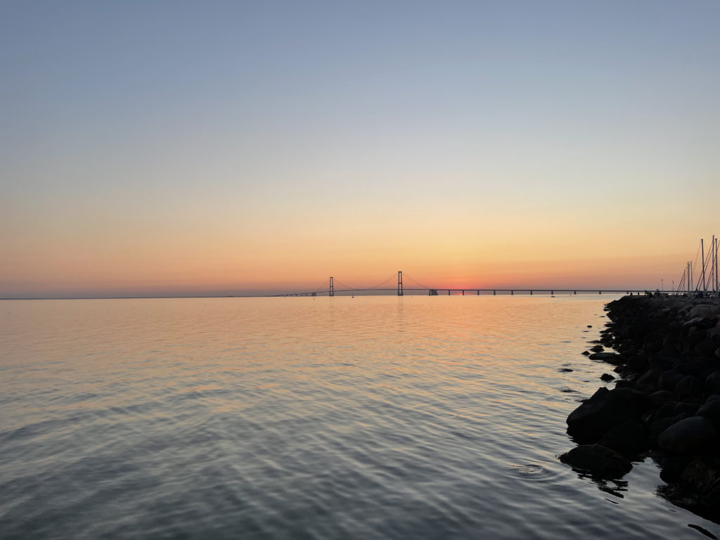 Abends kommen wir an unserem heutigen Stellplatz direkt am Meer mit Blick auf die Storebæltsbrücke in Korsør an. Nach dem Abendessen gehen wir eine Runde spazieren und kommen beim Hafen und den schönen Straßen zur Ruhe.